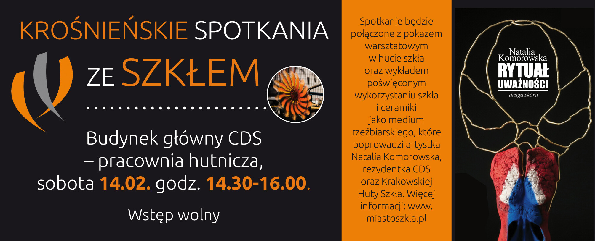 Wydarzenie — spotkanie autorskie z artystką — odbędzie się w ramach cyklu „Krośnieńskie Spotkania ze Szkłem” i będzie połączone z pokazem warsztatowym w hucie szkła oraz wykładem poświęconym wykorzystaniu szkła i ceramiki w medium rzeźbiarskim.